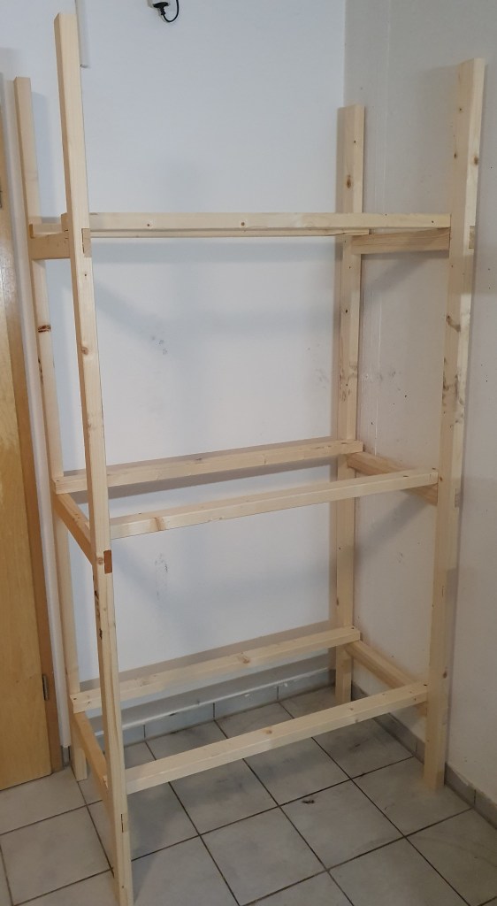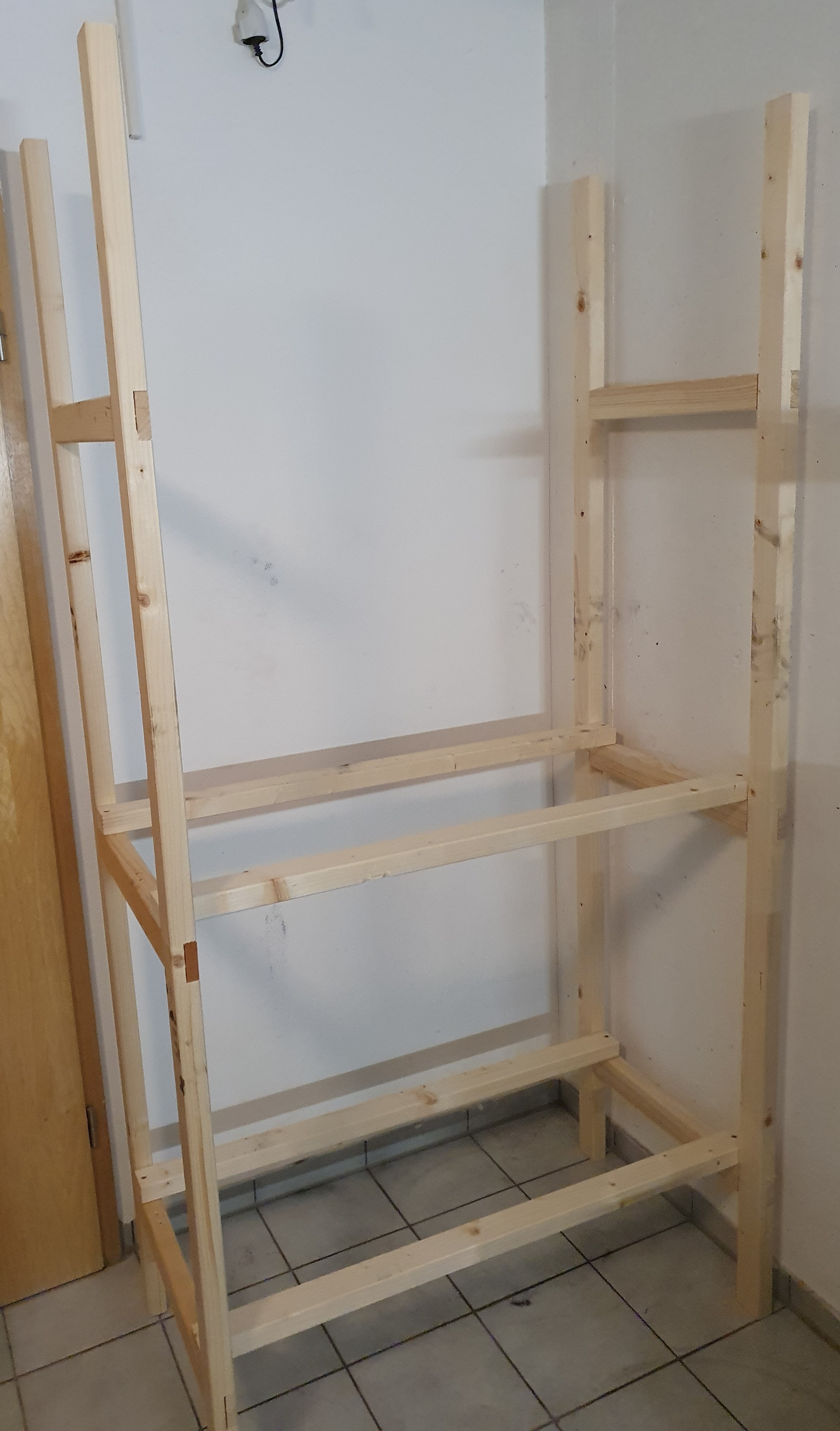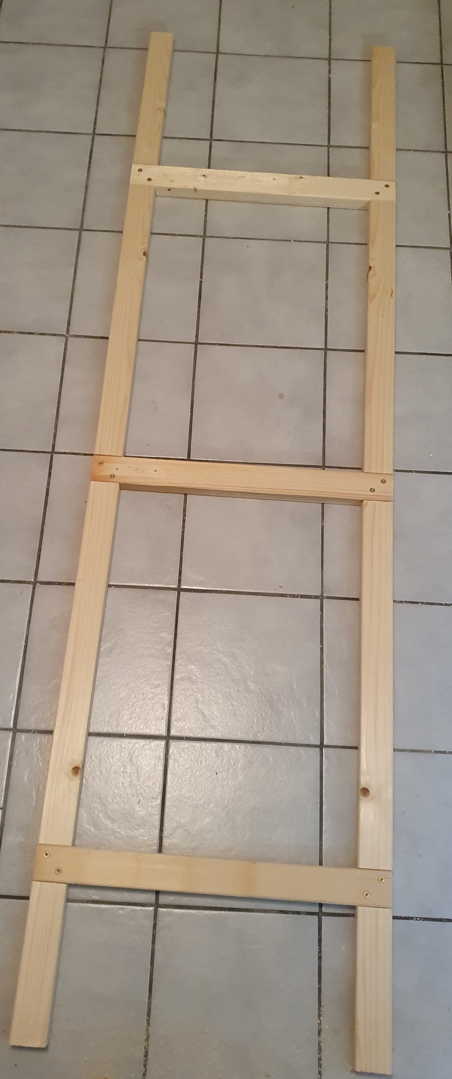 Dann werden zwei ‚Leitern‘ aus den Leisten gebaut, wobei die Quer- und Längsstreben mit einer Überblattung verbunden werden. Die Längsstreben sind 2m lang und die Querstreben 59cm.