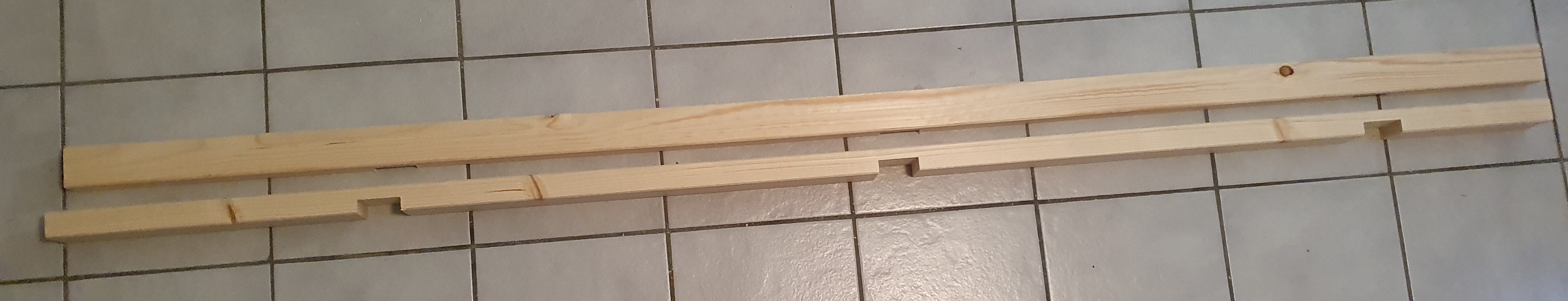Bei den Längsstreben müssen jeweils drei Ausschnitte gesägt werden, Tiefe und Länge sind wieder 18mm und 55mm. Dabei liegt der erste Ausschnitt bei xcm, der zweite bei xcm und der dritte bei xcm von der unteren Kante.