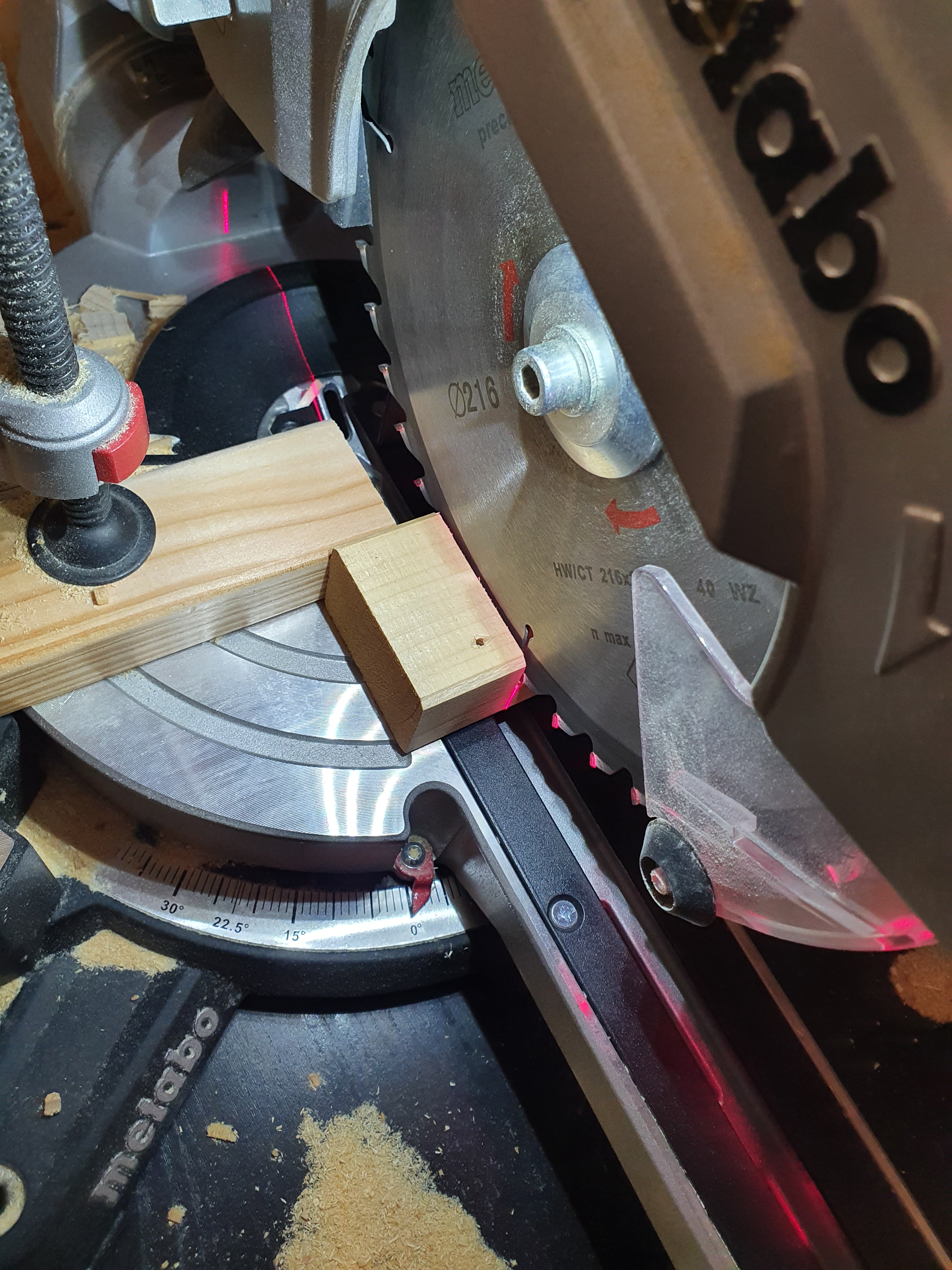 Für die Überblattung muss bei den Querstreben an beiden Enden auf die Hälfte der Leistendicke Material weggesägt werden. Also in diesem Fall hab ich den Anschlag der Kappsäge auf eine maximale Tiefe von 18mm eingestellt und dann auf einer Breite von 55mm das Holz in kleinen Schnitten eingesägt. Danach kann man mit einem Stecheisen und einem Schleifpapier die Fläche noch glätten. Da dabei sehr viel Staub ensteht sollte eine Schutzmaske bei der Arbeit getragen werden.