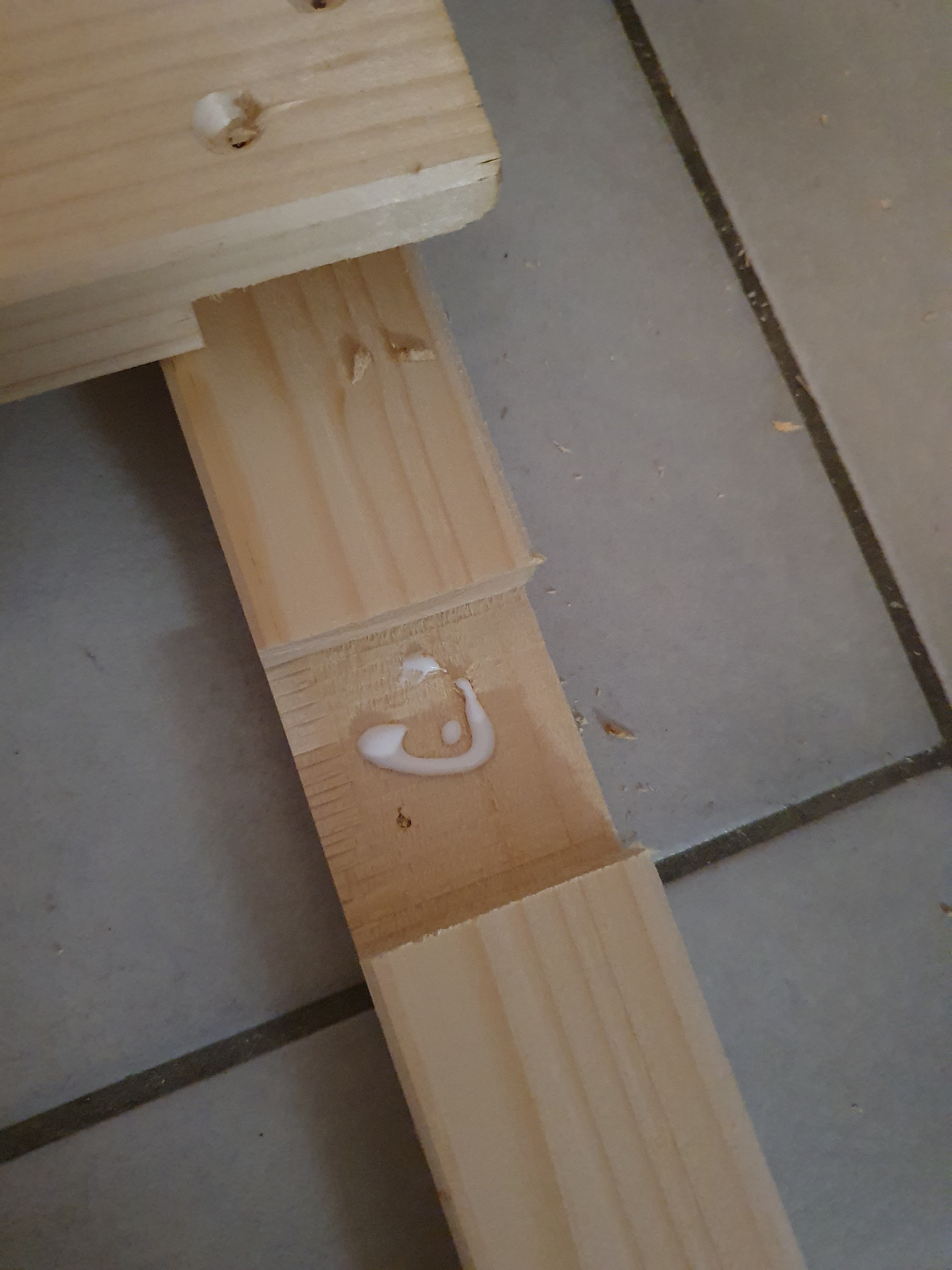 Die kurzen Leisten werden dann jeweils mit zwei Schrauben rechts und links mit der langen Leiste verschraubt. Wichtig dabei ist vorbohren und senken. Zusätzlich hab ich noch Holzleim dazwischen.
